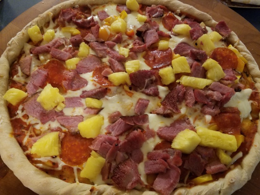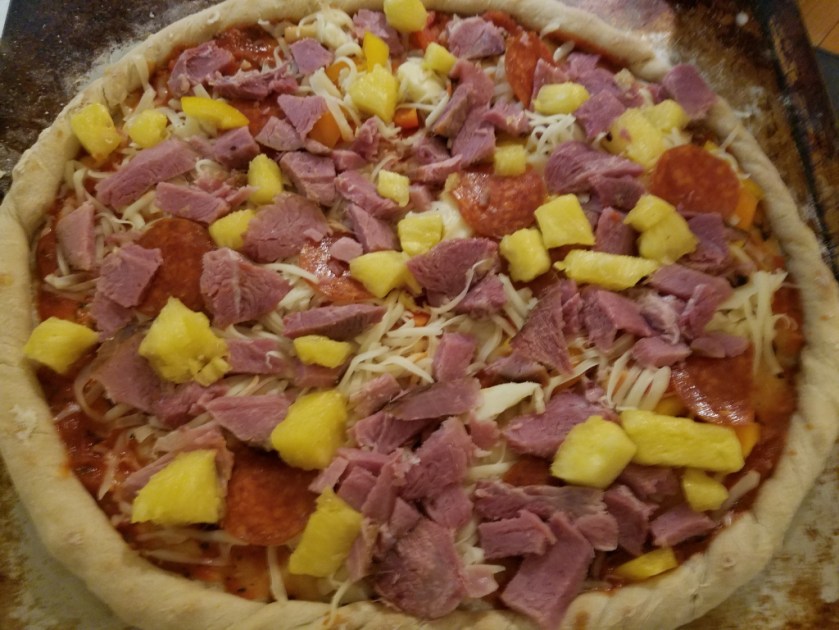 I never order ham and pineapple pizza, when I go out for pizza, or when I order pizza for delivery. It seems like such a silly thing. I prefer a more classic pizza, I suppose. But, when life gives you ham and pineapple, it’s time to make Hawaiian pizza.